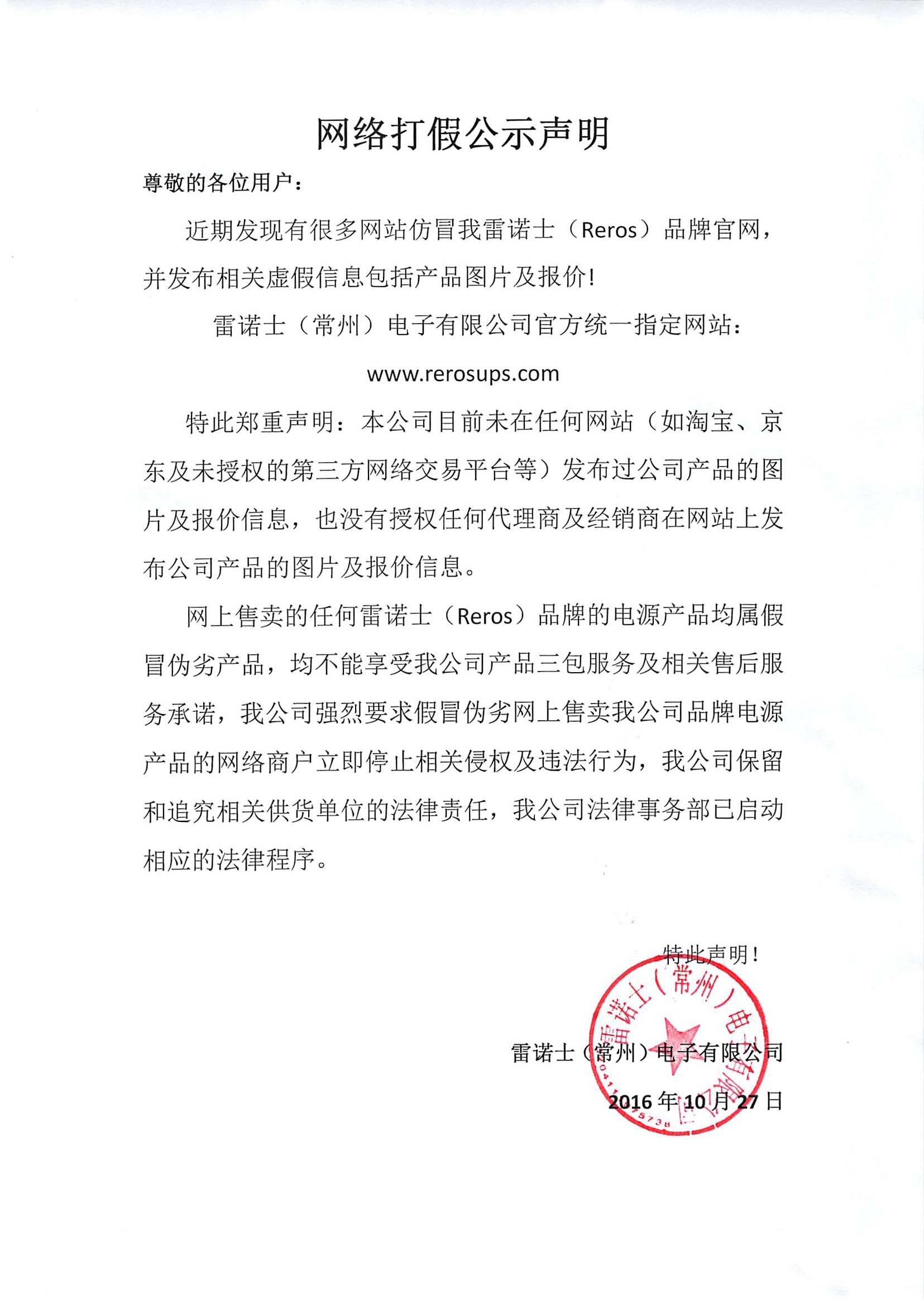 网上售卖的任何雷诺士(Reros)品牌的电源产品均属假冒伪劣产品,均不能享受我公司产品三包服务及相关售后服务承诺,我公司强烈要求假冒伪劣网上售卖我公司品牌电源产品的网络商户立即停止相关侵权及违法行为,我公司保留和追究相关供货单位的法律责任,我公司法律事务部已启动相应的法律程序。